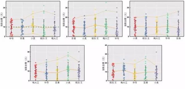 图6.五种顺序下抢到的金额 直观上看大家平均都在10块上下波动 下面我们忽略人的因素,把五张图的数据汇总到一张图上!