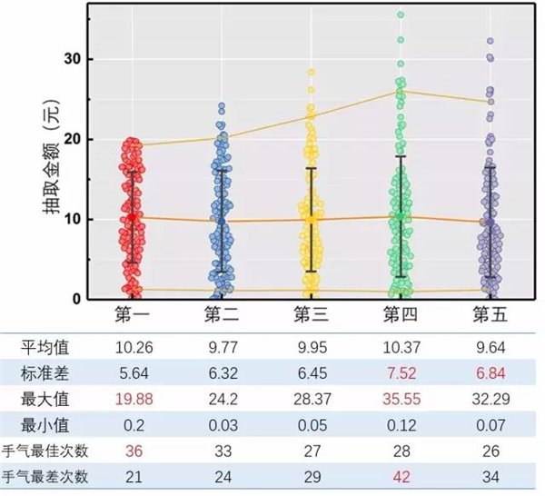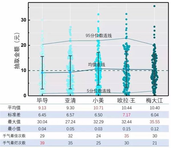图4.五个人抢到的金额频数分布直方图 呃……至少五个人都能抽到大红包……脸还不算太黑……那么究竟谁最厉害呢?请看下面的散点图以及表格数据