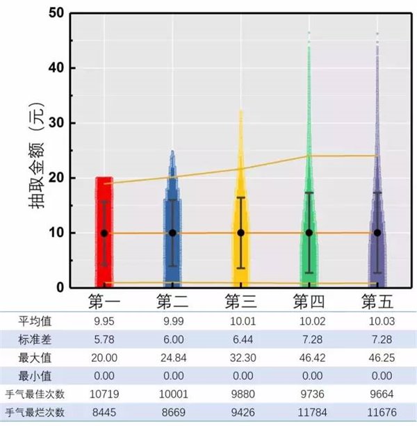 图9.不同先后顺序抢到的金额汇总(五万次模拟) 结果一切尽在掌握之中!均值相同,标准差变大,第一个人有最多的“手气最佳”! 由于最近真的有人拉我玩“手气最佳发红包”的游戏,吓得我赶紧给自己发了一千万个红包研究理论规律。 毕竟这个游戏里只抢不发闷声发大财是坠吼滴,一抽到手气最佳之前抢的钱都白费了。