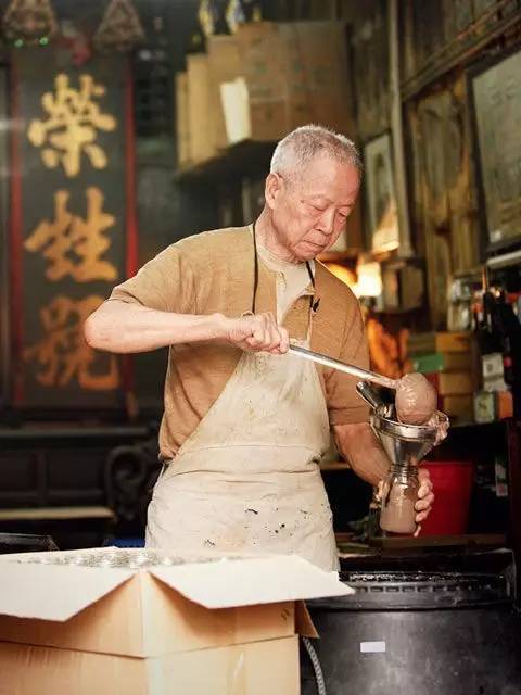 澳门李锦记总店老店员威叔 而这边厢, 传到第三代的“荣甡”, 依旧不紧不慢,不慌不忙, 坚持用最古老——炭火煮蚝油。 仿佛外界的一切纷扰, 都与之无关。