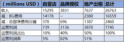 其二,从两种门店的利润产出来看。 扣除运营成本后,直营店的利润为22亿美元,而加盟店的利润却高达55亿美元——也就是说,比直营店还少的加盟店带来的收入,却为麦当劳贡献近7成的运营利润! 如果我们将麦当劳看成三个部门:直营店,品牌授权(向所有门店收取4.5%的授权费),地产租赁(向所有门店收取10%租金),就会得出这样的一份报表: