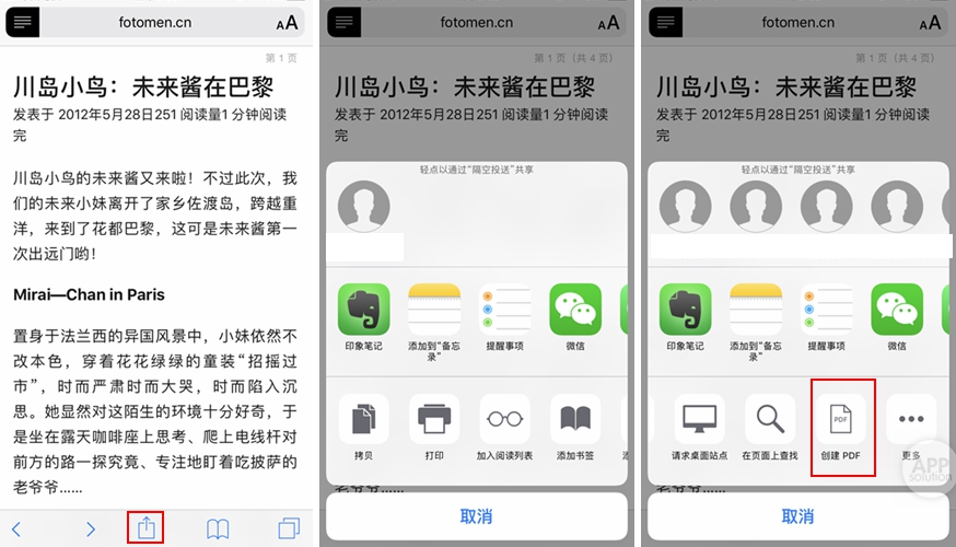 点击下方状态栏的「分享」,把最下一栏滑到最后,看到「创建 PDF」,点击。