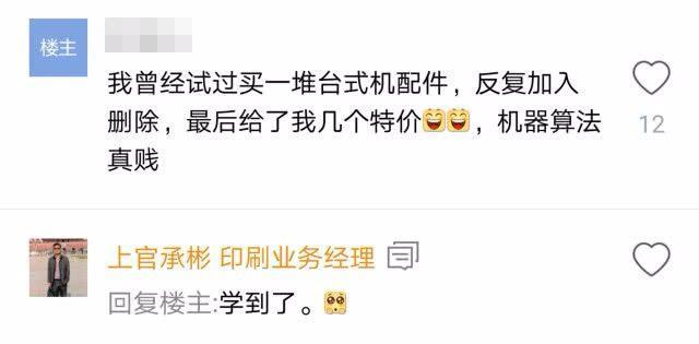 楼主表示亲测有效:我曾经试过买一堆台式配件,反复加入删除,最后给了我几个特价,机器算法真贱。 也有网友表示:我来证实,楼主说的没毛病,之前买台式机。每天看活动看折扣,添加又删除,然后突然有一天发来短信给我专属特价,便宜几百。