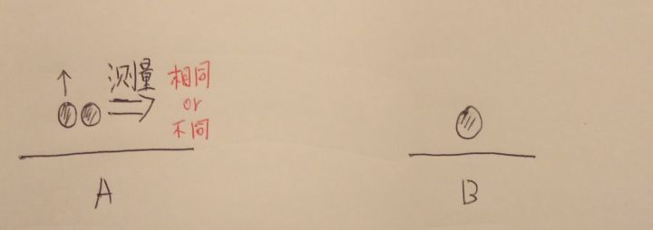 第二步 对这两个挨着的电子进行测量,但是不是直接测量它们各自状态,而是去测量比如它们两个的状态是相同还是不同。