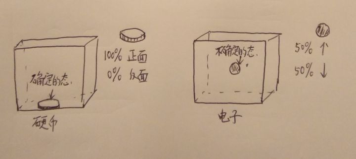 一个电子类似于硬币,也是有两种状态,上旋和下旋。 一个盒子里有两个电子,这两个电子的状态也是随机的,那么在打开盒子观察前,盒子里的电子也是有如图的四种可能。