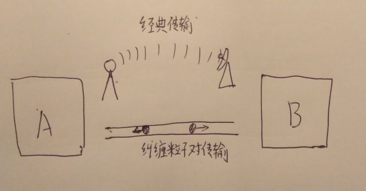 量子加密通讯有两条传输通道,一条传递纠缠粒子对(通常是纠缠光子),一条利用电磁波传输经典的信息。