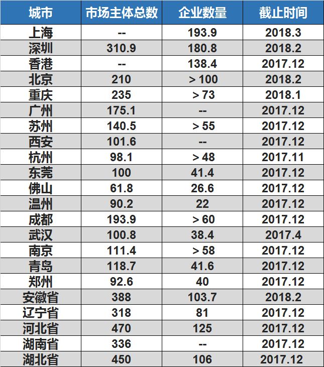 由于缺少关键统计数据,或者数据失真,在中国研究经济问题难度很大。 地方政府的“常住人口”、“GDP”参考价值不大,过去几年,在研究城市竞争力和房价上涨的时候,我率先提出了两个重要替代指标——“小学生人数”和“金融机构本外币存款余额”(资金总量)。 如今,这两个指标的有效性已经被广泛接受,频繁出现在各种研究报告里。 其实在研究城市竞争力和楼市走势中,还有多个指标值得参考,比如“居民用水用电”变动幅度,“城市生活垃圾”的变动幅度,“城市的快递业务量”等等。 今天,我想跟大家探讨的一个重要指标是:一个城市的商事主体(市场主体)数量,与城市竞争力、房价的关系。也就是在工商局(市场监督局)登记的企业数量、工商个体户的数量。 昨天(4月10日),上海有媒体发布新闻说:截至今年3月,上海累计企业数量达到193.91万,相当于每1000人拥有77户企业,这一密度居中国首位,并超过伦敦、东京等大都市。 其实“每1000人拥有的企业数量”,上海不仅远远低于深圳,还远远低于香港。 在市场主体的统计和信息公开上,深圳是做得最好的。基本上每月的数据报告都可以查到,其他城市基本上查不到。如果以媒体公开报道的193.91万家企业来看(截至今年3月末),上海的确是超过了深圳、香港,但深圳、尤其是香港的人口要比上海少很多。 深圳的数据是:截至2018年2月25日,市场主体总量(企业及个体户)共310.9万户。其中,累计企业180.8万户,累计个体工商户130万户。 香港的企业数量是138.4万户,相当于上海的70%,但香港的人口不到上海的三分之一。 一个城市市场主体数量越多,尤其是企业数量越多,这个城市的经济越活跃、越发达,这是毫无疑问的。 另外,一个城市市场主体占全省的比例越高,在这个省份里的地位就越高,资源集中度就越高。同样,在一个城市里:市场主体、新增市场主体集中的区,显然经济更活跃,房价更容易上涨。 但遗憾的是,很多省市都不及时公布市场主体数量,我们只能在网上查到只言片语。下面是一些城市公布的数据: 部分省市市场主体数量(单位:万)