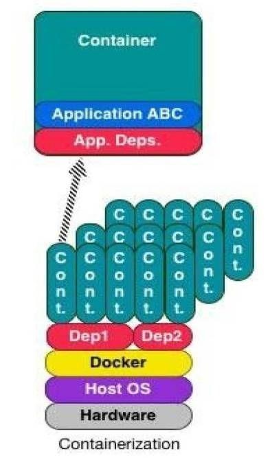 从企业层面来看,多虚一为主要形式,也就是将大量物理服务器集群虚拟化,形成一个资源池,在这个资源上创建各种不同的虚拟机,实现灵活部署。 理解Docker容器 其实docker和虚拟技术很像,但又有一些不同点,一方面是两个技术的层级上,虚拟机一般是底层硬件Hardware支撑,上层是虚拟管理系统Hypervisor层,在上层开启不同的VM业务,如果需要将这些业务进行隔离,需要每个VM启动客户机操作系统,非常消耗资源。使用Docker容器运行多个相互隔离的应用时,如下图: