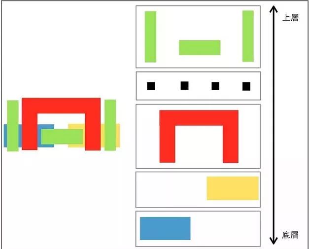 首先,在这裡可以将红色的部分比拟成高楼中的一楼大厅。一楼大厅,是一栋房子的门户,出入都由这裡,在掌握交通下通常会有较多的机能性。因此,和其他楼层相比,在兴建时会比较复杂,需要较多的步骤。在 IC 电路中,这个大厅就是逻辑闸层,它是整颗 IC 中最重要的部分,藉由将多种逻辑闸组合在一起,完成功能齐全的 IC 芯片。