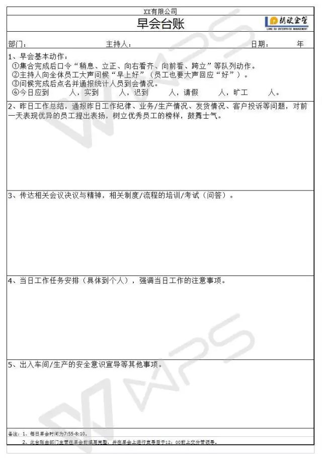 1. 班组早会 基层管理是经营、管理企业中最基础、最重要的一部分,只有做好基层管理,一个企业的根基才牢固,同时企业的凝聚力也会更强,这是一个企业快速的必要条件。而班组早会是做好基层管理的重中之重。