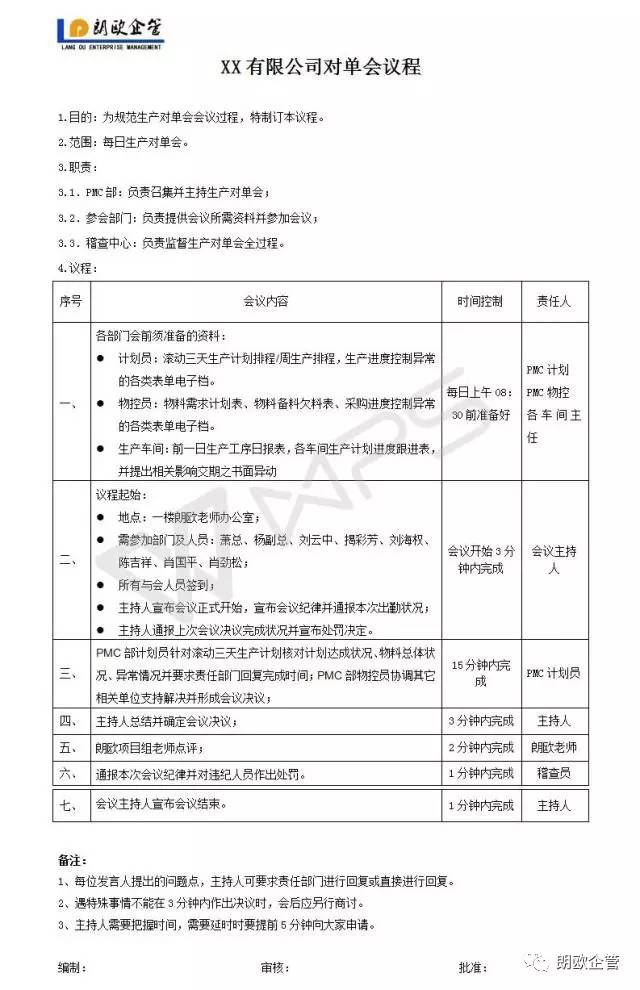 1.昨日生产计划、各个车间的达成情况的总结检讨 完成了的,我们要进行考核、奖励、通报。没有完成的,我们也要考核,按照计划任务的流程,该怎么考核就怎么考核。 我经常讲企业的PMC运行得怎么样?只有一个动作来衡量,那就是看你每天能够对你的日计划的达成情况进行考核吗? 如果你能够每天对昨日的计划完成情况进行考核,并且能够考核的下去(大家没有意见),就证明你这个企业的PMC运行的状况是非常好的。如果考核不下去或者是没有做考核,或者考核下去大家一肚子意见,那证明你的PMC运行状况是不好的。 2.明确今日各个车间的计划任务 3.对异常进行排查 我们各个部门要完成今天的日计划、要完成明天的计划,有一些什么样的异常需要大家协作来处理。我们在会上进行一个高效的沟通,做到三定:定人、定时、定动作。即,谁?什么时间点?要完成什么动作?(解决什么异常) 4.时间控制:生产协调会的时间尽量控制在30分钟以内 我们前期刚开始召开生产协调会的时候,召开的时间会长一点,因为很多企业原来没有开过,或者我们开的时候很多的异常曝光出来,大家可能就会觉得:我们原来没有开这个协调会,好像还没有这么多异常,怎么一开会就有了这么多异常。 其实,异常是一直存在的,我们通过很多管理的动作,让原来潜在下面的异常呈现出来了而已。 当这个会议过程经历了2到3个月左右,我们的生产协调会就会变得非常有效率。而且能够让各个部门围绕着我们日计划的达成,进行一个高效的沟通。 生产协调回,它不是问题讨论会,更不是生产茶话会,时间尽量控制在30分钟以内。