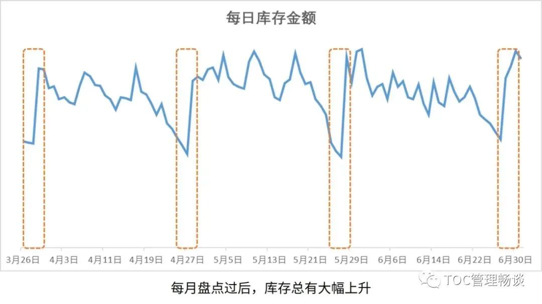 这种做法的目的,就是让库存数字变得好看。在这样的企业里,库存金额呈现一个有趣的曲线,在大部分时间居高不下,但是到了月底就会有一个大幅下降,接着过几天又反弹上去,如此反复。如下图。表面上看,控制库存仅仅是对企业的存货有影响,但实际上它伤害到许多目标。对于生产运营部门来说,最容易降低的库存是消耗快的物料;而最难降低的是那些消耗慢的物料库存。