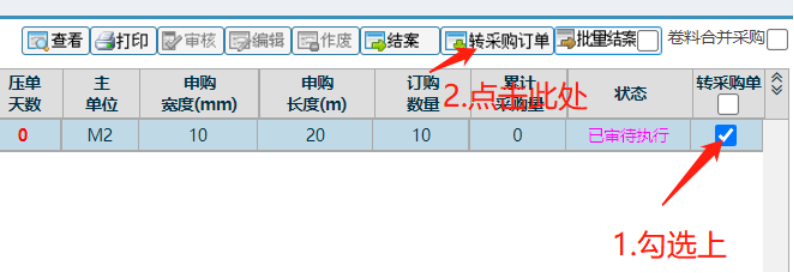 在本页面查询刚刚新建申购单的信息,然后勾选上方框,接着点击”转采购单”如图2