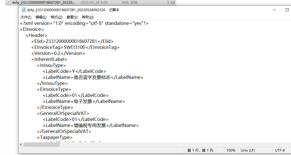 XML不同于PDF和OFD,形式上只是一串代码,记录发票的全部元数据,其样式如下: