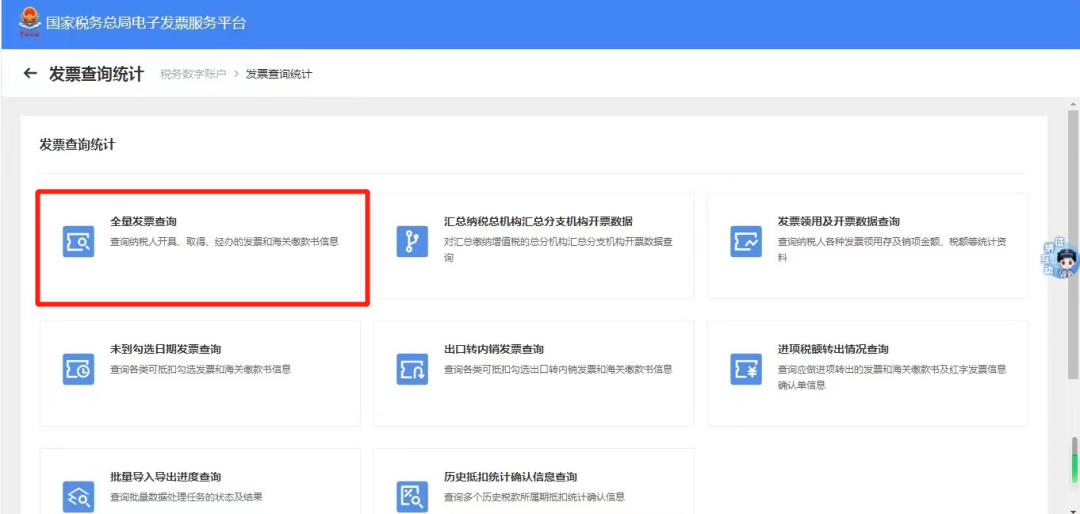 ②在【发票查询统计】界面,找到位于“发票查询统计”下方的【全量发票查询】按钮;在【全量发票查询】界面,查询类型选择【开具的发票】,点击“查询”。