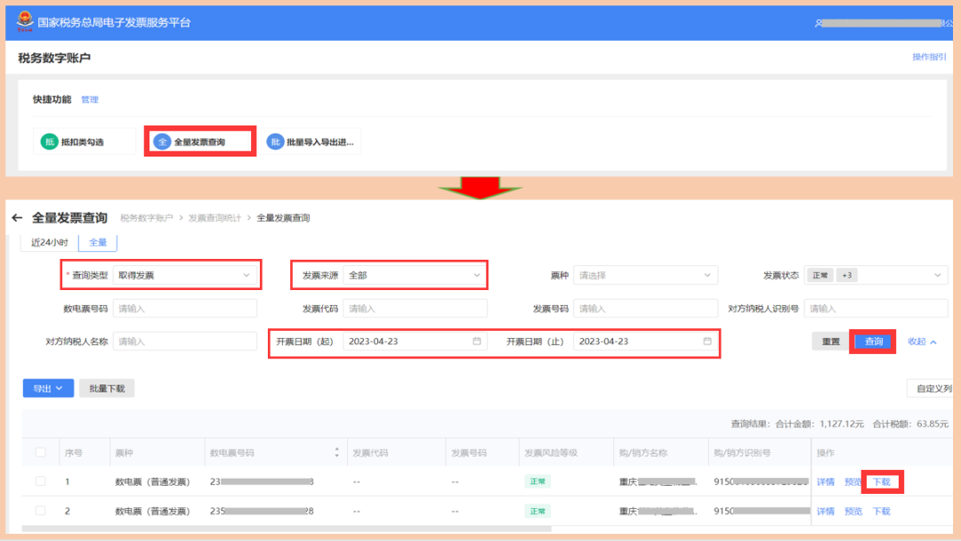 很多伙伴认为数电票XML格式文件只能是开票方下载?注意啦:购方和销方均能下载。登录电子税务局,点击【我要办税】-【税务数字账户】-【全量发票查询】,查询类型选择【取得的发票】,发票来源选择【全部】,选择要查询数电票的开票日期起止段,点击查询后即可下载存档、打印。