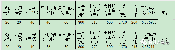 分析直接人工差异:直接人工差异主要是由工作效率和工时利用率引起的。在实际工时构成中,我们首先想到的是效率的提升,效率提升固然是降低工时实际成本的有效途径。但另一个非常重要的因素一一实际工时构成也会影响工时成本,我们通过一个例子来分析工时构成对成本的影响:假设员工日薪 40 元,我们预测的时候是每个工人平时加班 40小时 (36 小时按照基本工资的 1.5 倍计算,超过 36 小时按照 2 倍计算)、周日加班 60 个小时当月满勤天数 20 天。不考虑其他因素,我们计算的标准人工成本 =20 x40+[36x1.5x (40/8) + (40 -36) x2x (40/8)] +60 x2x (40/8) =1710 元,每小时的成本 =1710/ (20 x8 +40 +60) =6.5769 元/小时。而我们实际出勤平时加班 36 个小时,周日加班50个小时,计算得到的结果是 6.3821 元/小时。这只是其中的一种情况,更多的是因返工造成工时的双倍消耗。