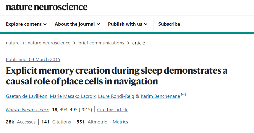de Lavilléon, Gaetan et al. “Explicit memory creation during sleep demonstrates a causal role of place cells in navigation.” Nature neuroscience vol. 18,4 (2015): 493-5. doi:10.1038/nn.3970