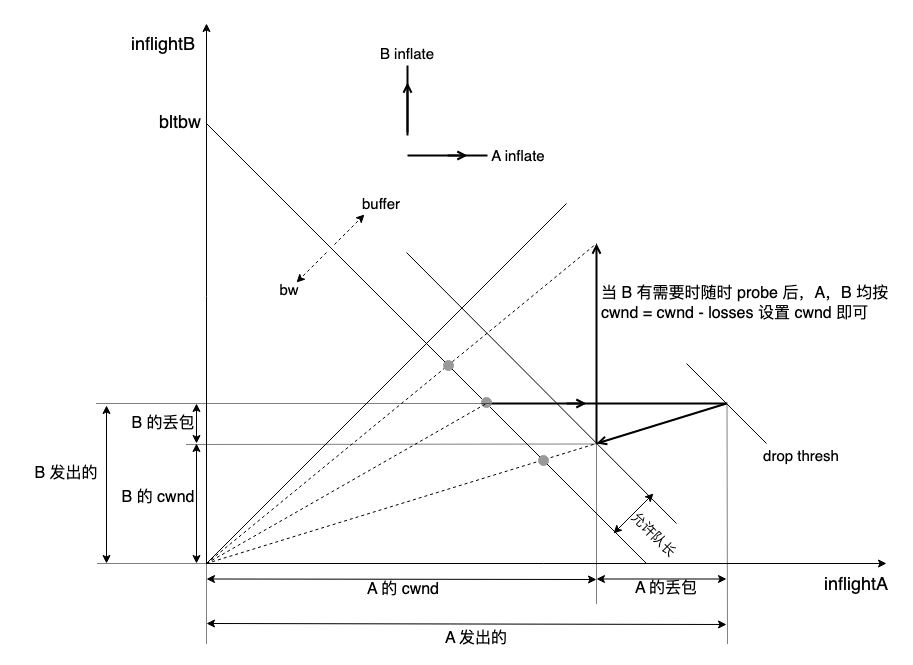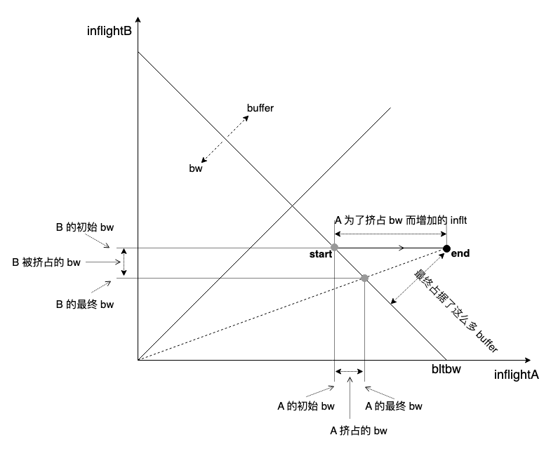 如果 B 倔强地也要保住自己在 start 点的 bw 怎么办?假设 B 确实通过 inflate inflight 保住了自己原来的 bw,A 又不服又要抢回来怎么办?来看看这个过程: