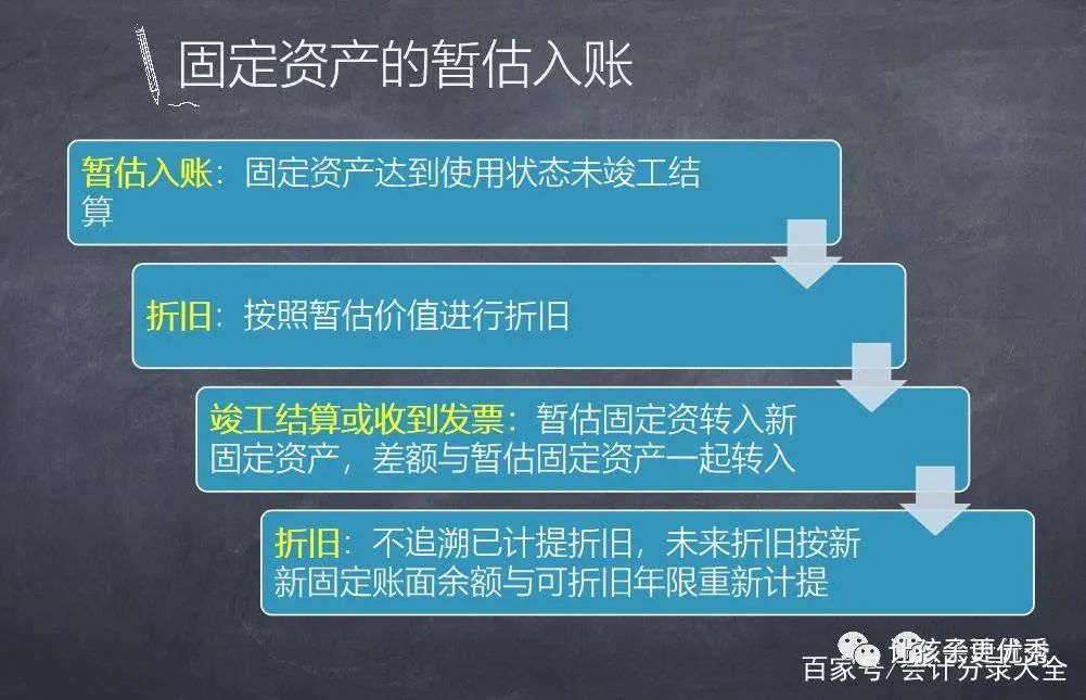 贷:应付账款——XX供应商 ——暂估 10000 ② 红字冲回暂估入库 贷:应付账款——XX供应商 ——暂估/无票 -10000 应交税费-应交增值税-进项税额 1560 贷:应付账款——XX供应商 13560 贷:原材料 -5000 贷:原材料 6000 固定资的暂估入账原因,相比存货更复杂。在固定资产已经使用,但在建工程仍未竣工;或者固定资产购入后已经开始使用,但发票未收到,账款未于对方结算。会导致固定资产的现有会计成本与实际不符,由于最终结算还未完成,所以只能采用暂估入账。 而固定资产投入使用后,下月即开始折旧,即使有该项固定资产未入账的款项,折旧不能等到固定资产结算完后进行,需要按现成本折旧。等工程结算后或实际发票到来后,以发票金额入账。暂估金额与实际发生金额之间的差异不追溯,只调整以后期间折旧费用。