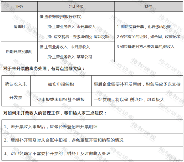 1.从纳税上来讲,不管是做未开票收入还是直接开具普通发票,都没有造成少交税款。 2.但从税务管理和客户管理来看,做未开票收入更便于客户管理。一般纳税人,增值税申报附表——《增值税纳税申报表附列资料(一)》中单列“未开具发票”一栏。小规模纳税人没有单独的未开具发票申报栏次。 注意:未开票收入正数和负数需要企业留存好业务发生的证据链。 3.从发票管理办法来讲,销售或者提供了服务,就应开具发票。因此,对于不要发票的客户,也应当场开具发票。 4.从税务预警评估风险看,由于进项有发票,若是销项不开票,发票电子底账系统容易造成进项销项不符,有进无销。 因此,建议依法开具发票。