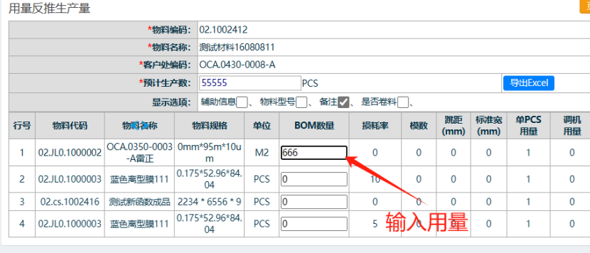 在新窗口里输入用量可以推算预计生产量,输入数量后回车即可 如下图: