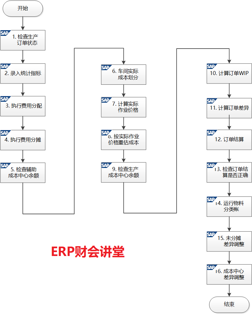 6)检查采购预制发票是否过账:MIR5查看发票凭证清单。如果企业使用了采购发票预制功能,结账前需检查是否所有的预制发票已经过账。采购发票预制会占用会计凭证编号,如果预制后又删除,会造成会计凭证断号。7)检查销售预制发票是否过账:VF05N查看销售发票清单。如果企业使用了销售发票预制功能,结账前需检查是否所有的预制发票已经过账。8)在建工程订单结算:KO8G订单结算,如果启用了投资管理功能进行在建工程管理,月底时需要对在建工程订单进行结算,将订单成本结转到在建工程上。9)运行折旧:AFAB运行折旧,AFBP查看折旧运行日志。10)检查生产订单状态:COHV批量处理订单,CO02单个修改订单,COOIS订单信息系统。生产订单结算之前,财务人员需要检查订单是否关闭,订单报工是否正确,订单的投入产出是否合理。例如生产100辆汽车,只消耗了50台发动机,明显不合常理。本步骤非常关键,影响到产品成本是否准确。如果结账完成后,发现成本异常,回头分析发现物料消耗不准确,此时需要反结账,然后再重新结账。这样不仅麻烦,而且产生了许多不必要的会计凭证。11)统计指标录入:KB31N录入统计指标。如果费用在不同的成本中心之间按固定比例分配,则忽略此步骤;如果按统计指标分配,则需要录入统计指标的量。12)执行费用分配:KSV5执行分配循环,KSV3显示分配循环。本步骤将公共成本中心的费用分配到不同的成本中心。例如,将水电车间的费用,分配到不同的生产车间。13)执行费用分摊:KSU5执行分摊循环,KSU3显示分摊循环。本步骤作用同费用分配,只是将公共成本中心的费用以次级成本要素的方式分配到其他成本中心。执行完费用分配/分摊之后,需要检查公共成本中心的余额是否为0。14)实际成本划分:KSS2执行费用分割,将生产成本中心的费用进行分组,计算每出一组的金额。15)计算实际作业价格:KSII计算作业类型实际价格,根据上一步计算的金额除以成本中心作业类型数量得到实际单价。计算完成后通过KSBT检查作业价格,如果价格为0说明计算失败。16)按实际价格重估订单成本:CON2按实际价格重估。订单报工时以计划作业价格从成本中心结转成本到订单,月底得到成本中心实际费用后,计算出实际作业价格,将作业成本差异调整到生产订单上。执行完CON2之后,需要检查生产成本中心余额是否为0,如果不为0需分析原因,再进行下一步操作。17)计算订单WIP:KKAO计算生产订单在产品金额。18)计算订单差异:KKS1/KKS5计算生产订单投入产出差异。19)订单结算:CO88生产订单结算。执行完CO88后,需要检查订单结算是否正确,公式为“生产成本-投入 + 制造费用 = 生产成本-产出”。例如生产成本科目编号为5001开头,核对5001*科目的余额和生产成本中心费用总额是否相等即可。20)运行物料分类账:CKMLCP运行物料分类账。运行物料分类账主要处理以标准价计价物料的差异,运行完物料分类账之后,差异科目余额应为0。一般执行到“过账清算”时,执行CKMVFM分析未分摊差异,然后再执行“过账清算”。21)未分摊差异调整:F-02录入凭证。执行完CKMLCP之后如果存在未分摊差异,手工将差异科目调整为0,一般调整至主营业务成本。22)成本中心差异调整:F-02录入凭证。执行CON2作业价格重估后,成本中心可能存在尾差(一般都是几分钱),手工将其调整至主营业务成本。如果以标准价计价的物料消耗到成本中心,执行完CKMLCP之后差异被重估到成本中心,此差异也需要调整到主营业务成本。