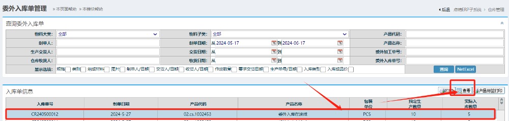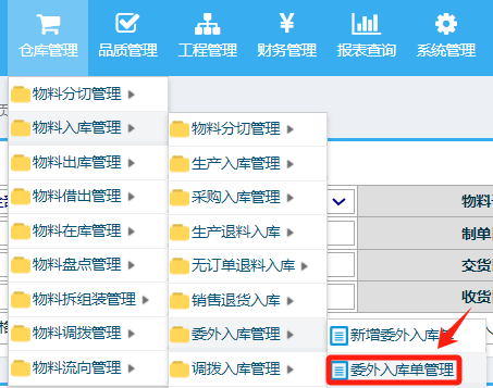 操作步骤: 仓库管理-物料入库管理-委外入库管理-委外入库单管理