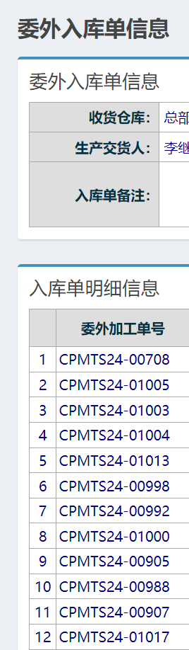 点击查看委外入库单,若有多个单号的就会重复显示 操作: 仓库管理-物料入库管理-委外入库管理-委外入库单管理