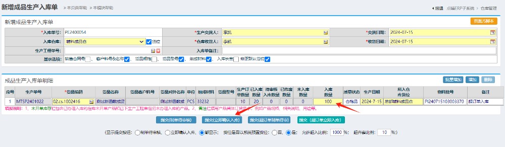 操作步骤:仓库管理-物料入库管理-生产入库管理-新增生产入库单,如下图所示:
