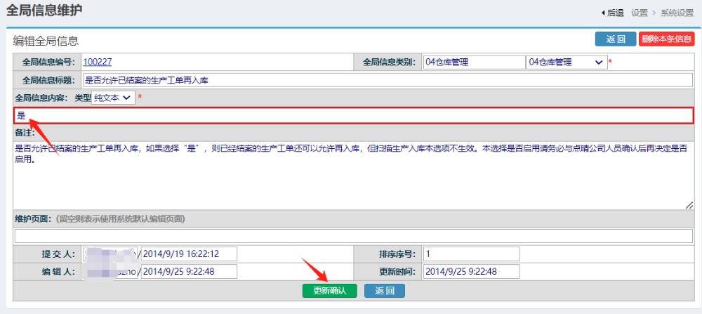 进入界面后,点击编辑按钮,将内容改成是,点击“更新确认”即可,如下图所示: