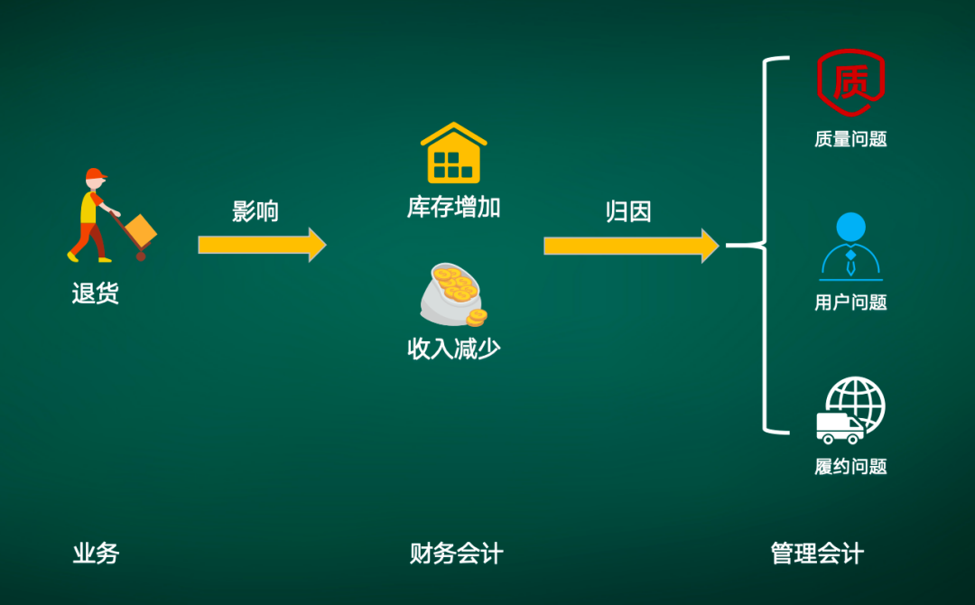 要回答这个问题,我们先来看财务的组织架构,分为财务会计、管理会计两部分;财务会计负责核算、资金管理、编制财报;管理会计主要负责预算、计划、管报。再看退货场景,退货,会造成库存增加、成本减少,同时应收账款、收入都会减少;既而管理层需要归因,分析退货原因,是质量问题,还是用户大爷任性想退就退?是快递小哥送货慢了,还是仓库发错货?如是质量问题,是库存商品质量还是快递过程损坏?