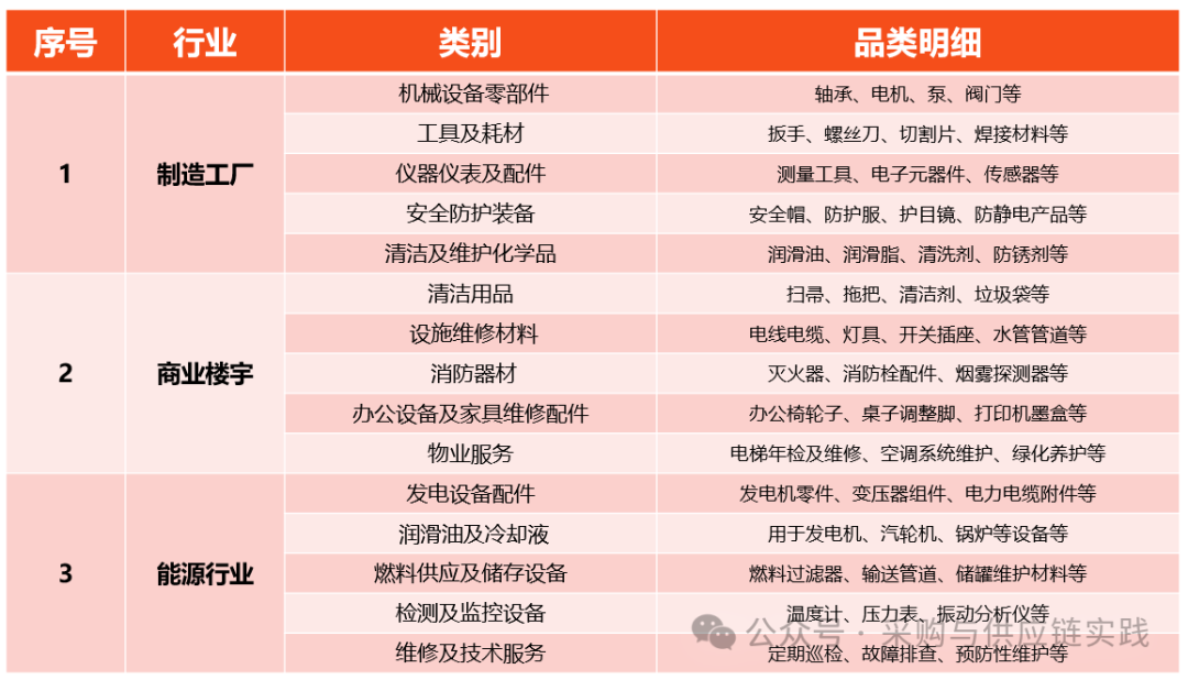 ![]() 1、采购量小而频次高:不同于大规模集约化的生产性原料采购,MRO采购涉及到的物料品类多且单次采购量相对较小,但采购频次较高,总体特点就是高频、量小、单价低、场景复杂。 2、物料种类繁多:MRO物料涵盖范围广泛,从螺丝螺母到大型机械设备的备件,各类规格型号复杂多样,增加了采购过程中识别和管理的难度。 3、紧急程度高:因MRO物料主要用于解决突发故障和维护需求,所以对采购响应速度要求高,有时需要迅速找到替代品或者进行紧急下单以满足交付要求。 4、供应商多样化:通常没有一个供应商能够满足所有MRO采购需求,企业需要与众多供应商建立合作关系,来满足不同类别的物料需求。 5、需求预测困难:由于MRO需求来源受设备状况、维护计划和意外事件影响较大,需求波动性较强,对库存管理和供应链协同能力要求较高。 6、物料标准化程度较低:MRO产品的规格、兼容性和定制化程度较高,使得物料标准化管理工作具有更大的挑战性。 7、电子平台应用:MRO采购流程逐渐采用电子商务模式,有利于提高效率、降低成本,同时也利于整合供应链资源和信息管理。 ![]() 1、制造工厂:在生产线上的生产设备发生故障时,需要及时采购更换零部件进行维修。 2、商业楼宇:物业管理部门需定期采购清洁用品、消防器材、电梯维护耗材及专业维保服务等。 3、能源行业:发电厂或输变电设施会采购各种润滑油、电气元件、检测设备等,以确保设备稳定运行。 4、交通运输业:航空公司、铁路公司要定期维护飞机、火车等交通工具,需要采购大量的机械部件、电子器件和相关服务。 5、办公环境:办公职场需采购打印机墨盒、办公家具维修服务、空调系统维护材料等,也属于MRO采购的一部分。 以下为MRO采购场景中比较典型的细分品类参考。 ![]() ![]() 点晴模切ERP更多信息:https://moqie.clicksun.cn,联系电话:4001861886 该文章在 2024/7/30 18:00:41 编辑过 |