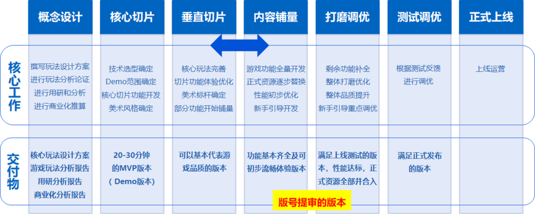 这几天最火的莫过于《黑神话:悟空》的上线发售,8月20日当天,登陆Steam、Wegame、EGS、PlayStation等多个平台。当天晚10点,Steam同时在线人数突破222万、持续位列Steam今日在线人数第一,并成为Steam有史以来同时在线人数最高的单机游戏。截至8月21日上午8点,该游戏全平台销量已经超过450万份,销售额超过15亿元人民币。8月21日,央视新闻进行了报道:中国神话,惊艳外国网友。据说,不少外国网友都在打听一只“猴子”的身世。8月20日当天,我身边的同事和朋友们也纷纷踏上了西游体验之路。无论是宣传视频,还是实际在PC上看到的画面体验,无愧于一款真正的3A大作:A lot of money,A lot of resources,A lot of time 。《黑神话:悟空》耗时4年之久,投资3亿-4亿元,一上线,就成为国产3A游戏的顶流。我们或许只看到成功的刷屏,看到各种的热搜,但作为一名从事游戏行业10余年的游戏项目经理,深感制作一款游戏的艰难。游戏项目是一种非常复杂的项目,涉及角色众多,不仅仅有策划、运营、前台开发、后台开发,测试、运维、发行等,且美术岗位又细分有交互、UI、动画、特效、原画、3D角色、3D场景、TA。除了角色以外,更重要的是游戏的开发内容,在实际项目研发过程中,所花费的时间往往都会比我们所想象的要长得多。尽管游戏项目很复杂,但是终归有一些策略,可以更好地对游戏项目进行管控,这就是今天要重点分享的按阶段管理策略。一个真正走向成功的项目,是需要按阶段进行管理的。换句话说,要对项目进行有效的管控,设定合理的里程碑目标是必要手段,所以,设定里程碑目标,也称之为按阶段管理。按阶段管理,不仅仅是为了更好地推进事情(目标)本身的达成,更需要在项目管理的过程中聚焦团队的信心、凝聚力、战斗力,以及团队成员随着时间的变化的体验峰值和终值。按阶段管理,强调的是项目是在逐个阶段基础上进行计划、监督和控制。从事的角度来说,分成多个管理阶段,是为高级管理层提供了整个项目周期主要间隔之间的控制点,也就是说项目经理在对项目进行整体规划的时候,需要设置几个重要的里程碑节点,以便对项目进行更好的管控。在每个阶段结束的时候,应该对项目的状态加以评估,尤其是商业论证和计划进行阶段性评审,以确保项目仍然有效。如有必要,甚至需要高层管理者做出项目是否需要继续的决定。作为项目经理的我们,必须要有一个清晰的认知,即在项目管理的过程中,只有细节是可管理和可预测的,才能编制计划。比如对一个中大型、为期2年甚至更长周期的项目来说,不可能会做2年的详细计划。一来是超越合理的规划周期编制计划会浪费大量的时间和精力;二来即便计划制定出来了,可执行性也非常差,况且这本身也不符合项目渐进明晰的特点。因此,更合理的做法是短期的详细计划和中长期的概要计划。那么要达成这样的目的,就需要根据实际情况,将项目划分成多个管理阶段,每个阶段就是一个关键里程碑。里程碑是有效控制项目在框架内推进的利器。既然按阶段管理的本质是确定项目的里程碑,那么该如何划分?近十年,我一直从事的是在互联网和游戏行业相关的项目。因此,划分项目管理阶段的实例将以游戏项目为例来阐述。通常来说,一个游戏项目可以划分为4个阶段:构思阶段、预制作、全面制作和后制作。但实际上,对于一款中大型项目来说,阶段划分需要进一步细化。结合这几年负责的一款中大型项目,我将其划分为7个阶段:概念设计、核心切片、垂直切片、内容铺量、打磨调优、测试调优和正式上线。在每个阶段,都有其核心工作和可交付物,如图1所示。