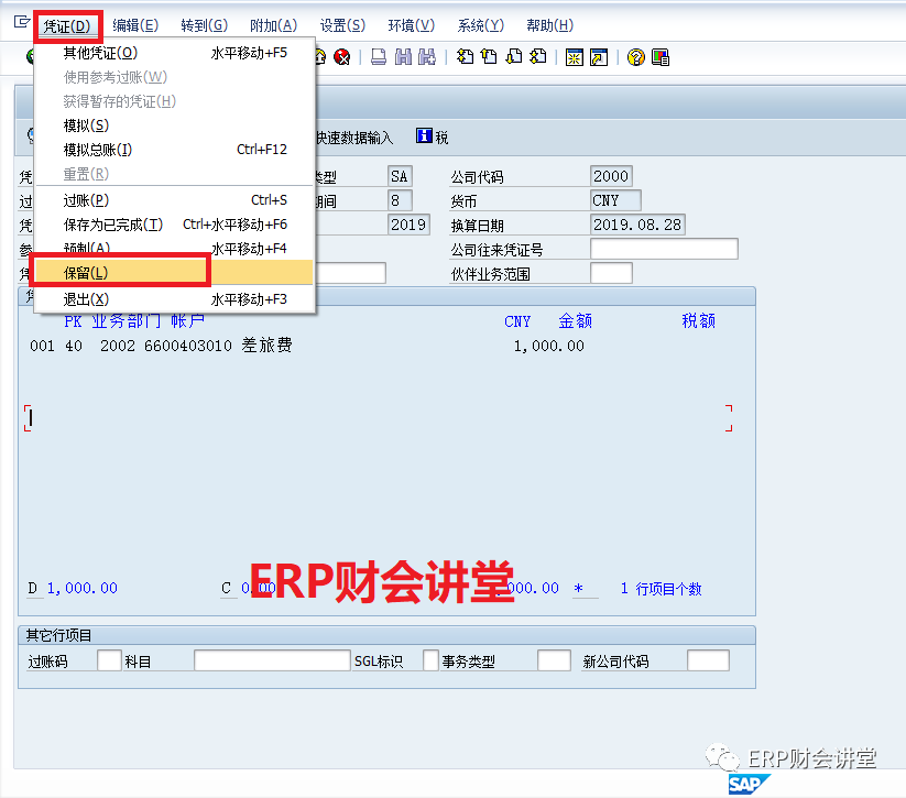 此时,因事需要离开,可以先暂存凭证,选择菜单栏“凭证->保留”,