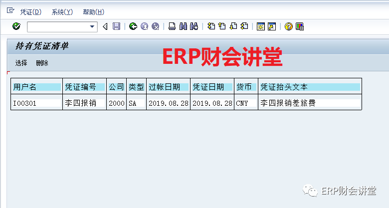 此时,再次去查看暂存凭证,可以发现张三报销费用的暂存凭证已经不在了,因为暂存的凭证已经录入完成,系统自动给删掉了。