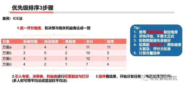 在实际工作中,每个企业和团队都会面临多个项目。 从组织整体层面来说,如何为这些项目排出优先级,想必是一个让很多管理者都感到头疼的问题,因为你不仅要考虑团队内部的工作任务,而且必须将这些工作与其他团队提出的需求进行权衡; 而从团队成员的角度来说,个人面对的是多个任务,甚至每个任务都来自不同项目(团队内项目和跨部门协作项目),正确排列出优先对于提升工作效率来说助益颇多。 使用优先级排序这个技巧时,大家不要简单认为只是排一个谁先做谁后做的事情,其真正的价值并不在于结果,而是通过这个过程,把多个人的观点与意见客观有效的达成一致。 优先级排序有三个常见场景,其中之一就是当项目很多,需要决策谁先谁后的时候,第二就是当大家需要对一件重要的事情做决断,但是又僵持不下时,第三就是自己无决策权,需要引导多方决策者进行决策的时候。 使用优先排序有四个关注点: 一、制定统一的评分维度,并确认每个维度的重要程度(权重),这两者都需要与决策者达成一致。 二、引入多元的视角进行打分,有时候决策者不一定充分了解业务,为了避免决策失误,可以引入业务专家进行打分,提升客观性。 三、打分过程不要过度的注重细节,因为排序的目的是要快速达成共识,有时把握大方向快速决策,会比意见僵持不下意义更大,在这个会上争出谁对谁错并不是最重要的,要给别人留一些余地。 四、要有冒险的准备,现在做的所有的排序都有可能会调整你原本的安排,比如说你现在做a业务,并且做了很长时间,投入大量成本,但现在市场环境都显示a业务已经在走下坡路,你能否去壮士断腕地把这个项目喊停。喊停其实非常困难,它对应到的是人的沉没成本问题,什么叫沉没成本?举个最简单例子:就是你如果买了电影票进去的看电影,你看到一个烂电影,但是你已经看了十分钟了,但因为已经花了钱,大多数情况你还是会继续看完。 案例:使用ICE方法进行产品优先级排序(影响范围、自信程度、实现难易) ![]() 当把方案都列举出来后,就可以开始进行优先级排序。 第一步:确定评价维度,例如影响范围,自信程度的难易度,并和决策者与相关利益者达成一致。 第二步:打分,这个时候方案A、方案B、方案C需要的业务经验跟常识都不一样怎么办?这时你可引入专家角色进行打分,不然有可能一个很好的项目就被不懂业务的人砍掉了。 第三步:根据排序结果执行方案,过程很简单,核心精神是三个:一,你要跟大家达成一致。二,你要引入懂这件事情的人来评分,三,要有壮士断腕的决心,根据客观情况来做决策。 ![]() 第一可以先看看公司是否有专家知道评估维度,如果有直接拿来推进就好了,如果你自己熟悉业务,自己先和决策人达成一致即可。