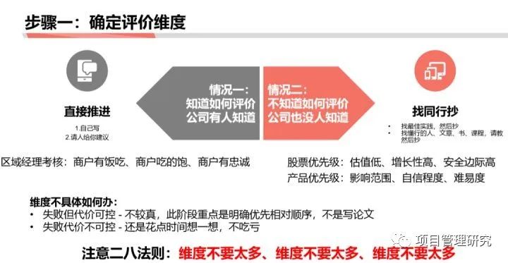 最后要注意选取的维度不要过多,尽量找影响结果80%当中最重要的20%的维度(二八法则),维度太多的话,虽然可能会提升精准度,但是会让大家人工评分过程非常痛苦,同时对排序的结果影响不大。 再来说下该如何进行投票打分,分成简单版与专业版。 简单版:大家开个会去打分,直接取平均或是加权平均(延伸阅读:德尔菲法)。 专业版:AHP法,建立一个层次结构模型,把你的元素确定下来,让大家去逐一比对两元素的相对重要程度,打完分之后,它会给你算出一个很精准的数字大小,让你可以去快速的去做判断,目前有很多第三方工具可以辅助记算分值,就算没有代码技能也能快速上手使用。 优先级排序小结 何时需要进行优先级排序?就是当项目太多,需要抓大放小,或是意见僵持不下的时候。 优先级排序的四大步骤,第一就是先制定统一的考量维度。第二就是多元视角进行打分。第三就是不要过度关注细节。第四就是要有冒险的准备。这是一个在管理、运营和产品都可以使用的技巧,大家一起共事,最怕就是大家无法一起合作,只有大家对目标有共识,方能更好聚焦,有效合力。 该文章在 2024/9/29 12:33:54 编辑过 |