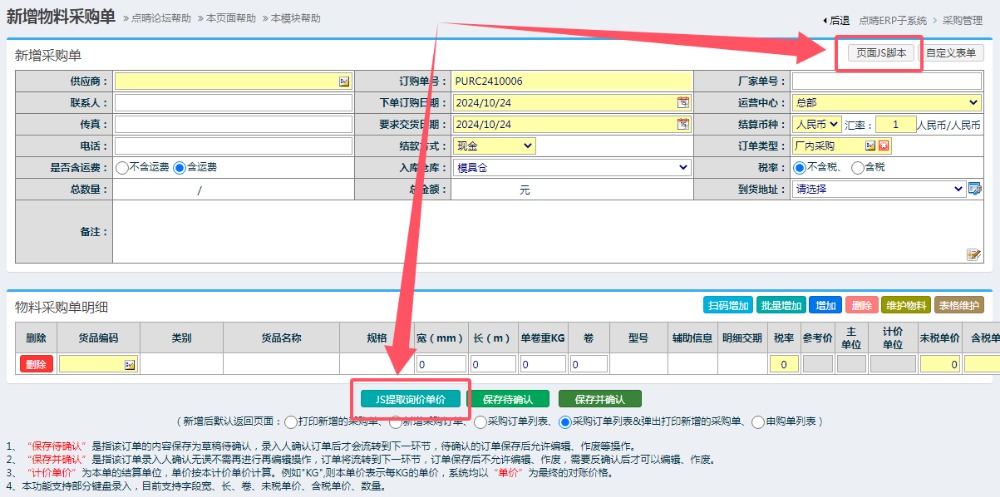 范例参见点晴ERP系统新增采购单-》JS提取询价单价: