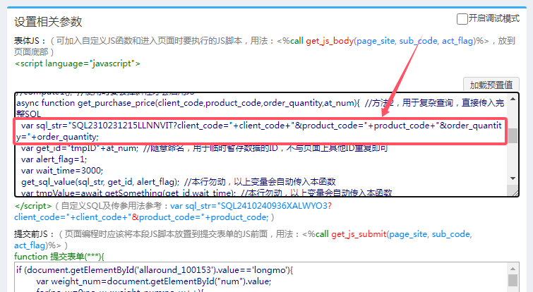 二、在下面的表体JS、提交前JS、提交后JS、按钮JS四个脚本框中,视需要引入上面增加的自定义SQL语句