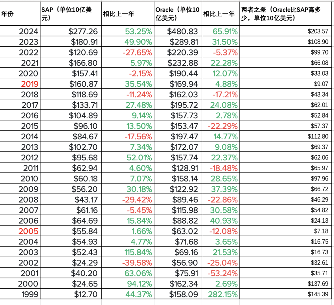两者的收购策略Oracle的收购策略Oracle的策略更侧重于大规模收购、市场垄断与技术补充。 其主要目标是通过收购云服务、数据库和应用软件公司来增强其云计算和数据库技术能力。 最具代表性的收购是2009年以74亿美元收购Sun Microsystems,以及后来的NetSuite和PeopleSoft。 这些收购帮助Oracle扩展了其云应用产品,并大大增强了其企业软件市场的份额。 SAP的收购策略SAP则更注重收购能够补充其核心业务的公司,特别是在云计算、人工智能、大数据等领域。其重要收购包括2012年以43亿美元收购Ariba(全球领先的采购网络平台),以及SuccessFactors ,快速布局云市场。 这些收购旨在增强SAP的云端服务能力,并将其ERP系统与新兴技术整合,为客户提供更全面的数字化转型解决方案。 收购收益和比较Oracle收益:Oracle通过收购大规模巩固了其数据库和云服务市场地位,尤其是NetSuite的收购让其在中小企业市场获得了强势优势。尽管一些收购整合较为复杂,Oracle通过其全栈云服务平台取得了显著收益。 SAP收益:SAP的收购帮助其快速进入云端市场。SAP的战略被视为使其在云计算领域获得了一定的领先优势,但在云基础设施领域并未直接挑战Oracle或其他大型云平台。 两者市值渐行渐远关于市值,两者最接近的年份一般认为是2005以及2019年左右。那时,SAP的市值接近Oracle,主要由于互联网泡沫的影响和两家公司在企业软件市场的快速增长。 SAP:2772亿美元,Oracle 4808亿美元。 2000年
