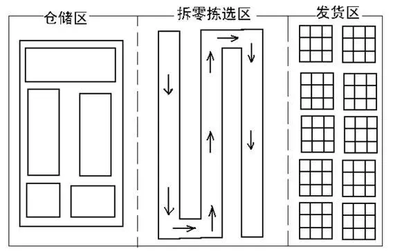 缺点:是货品品类较多时,拣货行走路径较长,拣货效率降 低;拣货区域较大时,搬运困难。