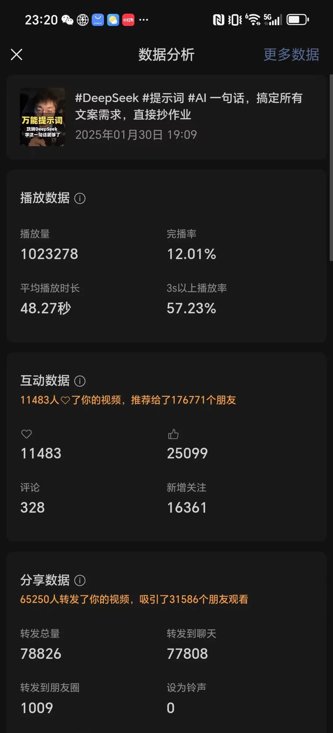 不得不说,DeepSeek不愧为刚刚崛起的华人之光,中国红客联盟一起保护的对象。这种推理型大模型给出的答案,与之前的AI相比,确实有很大提升。最后想说的是,不管是我自己的短视频公式、还是DeepSeek的拆解,说实话,都很难简单只凭一个框架,去复制另一个百万播放的视频。我这条爆款,更多的还是因为热点抢的早、运气好,以及多重因素的叠加。因为科学的思维:就是不断在成功和失败的案例中,慢慢找到背后的逻辑和规律。用被验证过的公式、框架、模板,可能无法让你「一步登天」,但一定可以「走在靠近成功的路上」。
