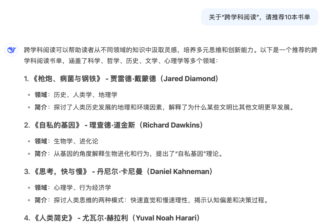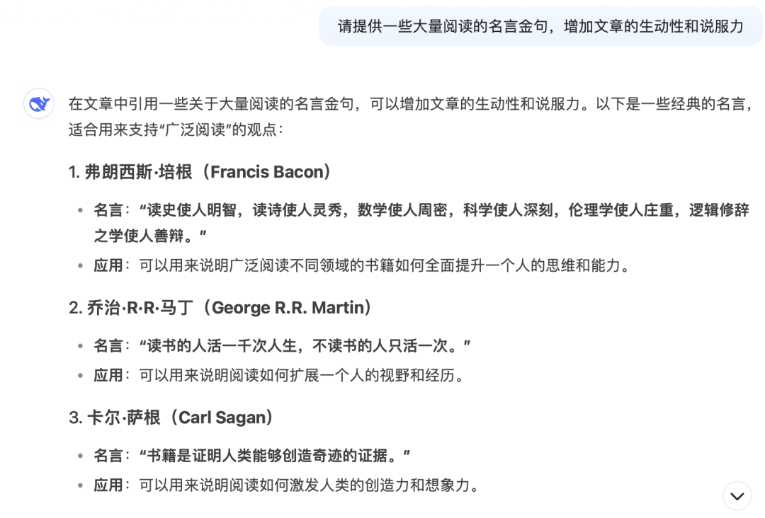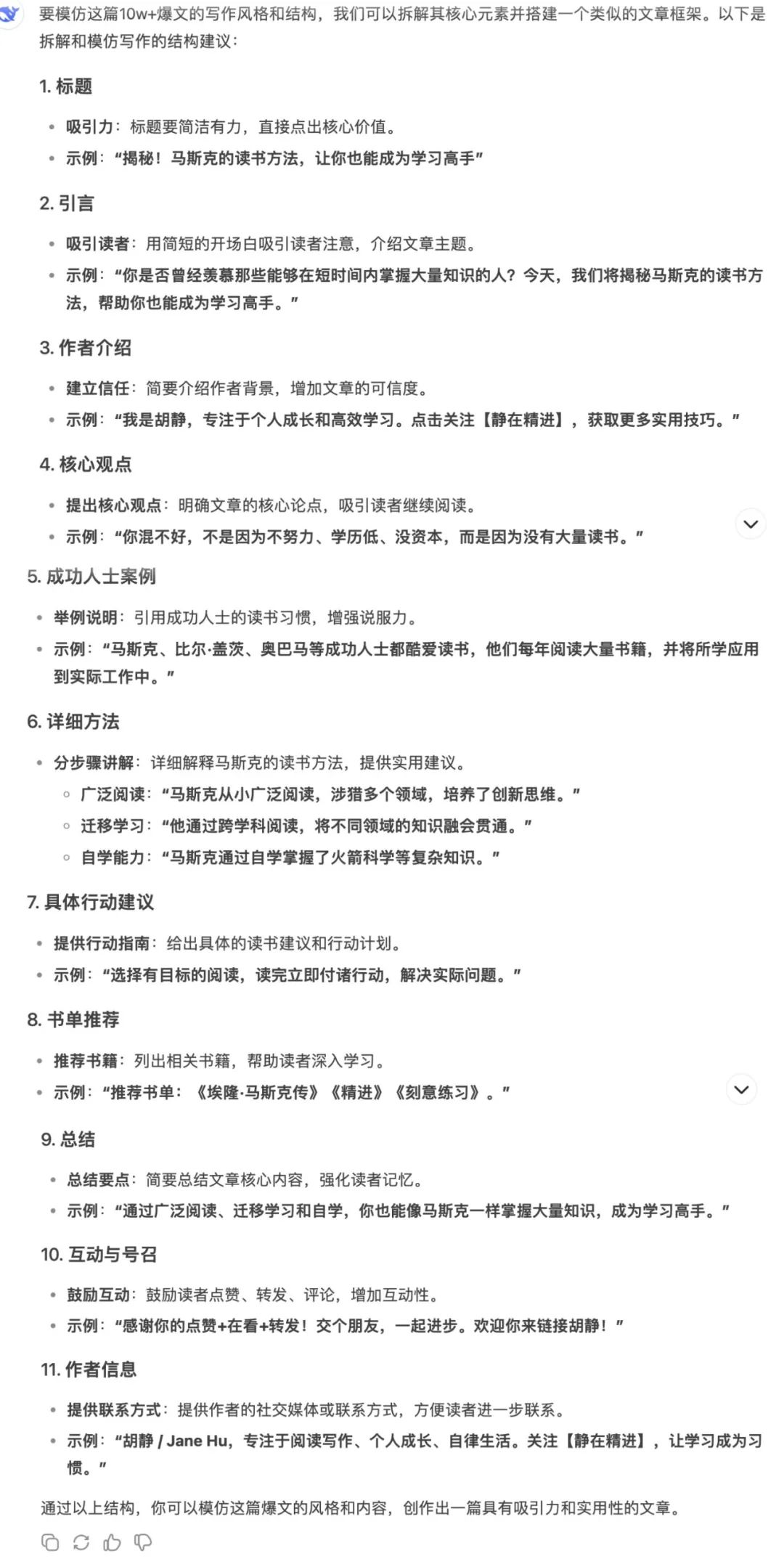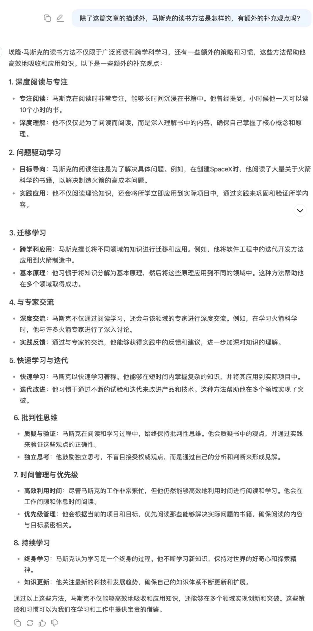 这样一来,文章结构有了,素材也有了,我们只需要把这些内容筛选拼接起来就可以了。过程中再加入一些自己的案例、感悟、想法等等,看起来更加生动有人味。比如这篇关于马斯克读书方法,只论述了3个观点。那马斯克还有哪些其他的读书方法呢?那我们也可以用这里面的观点进行补充写作,让内容更详实干货。利用这样的AI写作方法,搭建文章结构、获取素材、金句、观点都不在话下。1️⃣质量高。比如它提出的马斯克8大读书方法,质量非常高,可能我自己都无法盘点出这么详尽的内容。2️⃣速度快。一个问题基本上它几十秒到几分钟就能回答完毕,就以上三个步骤做下来,10分钟不到结构、素材、观点都有了。到时候简单拼接+自己增加一些感想和人话,一篇文章就成型了,3️⃣成本低。DeepSeek是一个免费的AI软件,根本没有任何搜索成本。比如之前可能还要读完《埃隆·马斯克传》才能写这样的文章,现在连读书成本都省去了。作为一个自媒体博主和写作教练,我希望大家可以避免「AI羞耻」。积极拥抱AI,把DeepSeek当作自己最好的写作助手,日常好好调教,好好和它磨合,节省时间精力成本。2025年了,真的推荐大家都去用DeepSeek!希望大家多多出爆文!