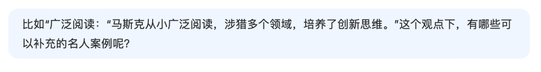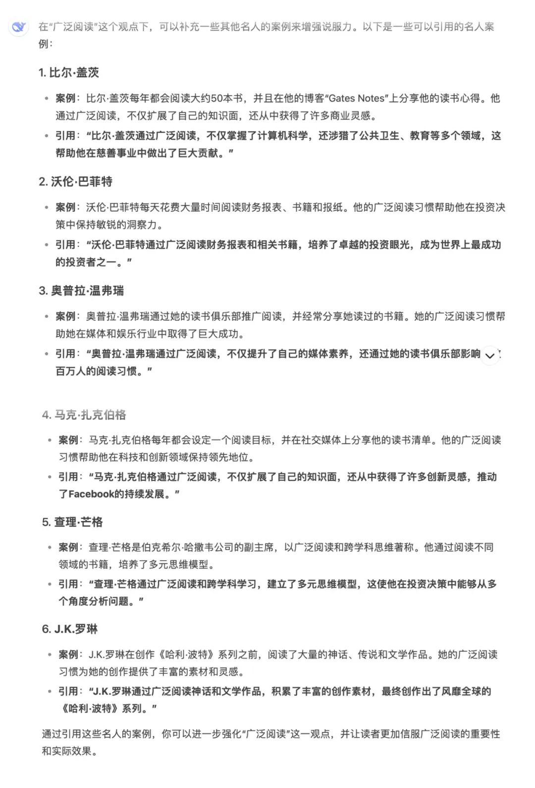 1️⃣主要的核心观点是:“你混不好,不是因为不努力、学历低、没资本,而是因为没有大量读书。”2️⃣文章的三个小标题结构就是:要广泛阅读、迁移学习、自学能力3️⃣每个小标题下的结构就是:成功人士案例+行动建议+书单推荐。4️⃣最后结尾做一个文章总结,与读者互动感召大家一起大量读书。1️⃣比如关于“广泛阅读”这个观点,我需要一些名人案例,我可以这样追问它:那我就可以用比如比尔·盖茨以及查理·芒格的案例来论证“要广泛阅读”这个观点。2️⃣除了提供案例之外,还可以追问名言金句,让文章更有阅读质感。3️⃣以及可以追问一些书单,让部分文章更干货,更有收藏价值。