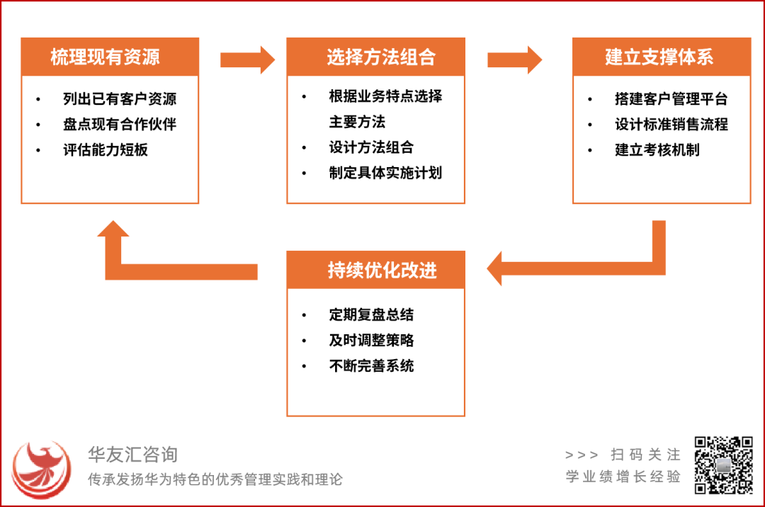 前面我们详细介绍了主动出击、吸引导流、资源协同三种获客方法,以及支撑这些方法的系统体系。在实际工作中,这些方法需要根据企业实际情况进行有机整合,就像中医讲究"辨证施治"一样,需要根据企业的具体情况来"开方配药"。这三种方法各有特点:主动出击适合快速打开局面,但成本较高;吸引导流重在长期积累,前期投入大但长期效益好;资源协同则可以借力使力,但需要有较强的资源整合能力。初创企业资源有限,建议以主动出击为主,快速建立基础客户群。成长期企业可以加大吸引导流的投入,通过内容营销提升影响力。成熟企业则可以更多地利用资源协同,通过战略合作实现规模化获客。 没有一种方法是包治百病的,关键是要找到适合自己的组合。就像中医讲究的"君臣佐使",要根据企业的实际情况,将不同的方法有机组合,才能发挥最大的效果。要将我们前面讨论的方法真正落地实施,需要遵循一个闭环的工作流程。这个过程就像是建造一座房子,需要规划、选材、施工和改进等多个环节的紧密配合。首先,要做好现有资源的梳理工作,就像是在建房子之前要先勘察地形。接着,根据实际情况选择合适的方法组合,这就像是选择合适的建筑设计方案。然后,建立起支撑体系,这相当于打好房子的地基。最后,通过持续优化改进来不断提升效果,就像是对建成的房子进行日常维护和升级改造。这个循环往复的过程不是一次性的工作,而是需要在实践中不断完善和优化的系统工程。每一轮循环都会带来经验的积累和能力的提升,从而形成一个良性循环的上升通道。总结