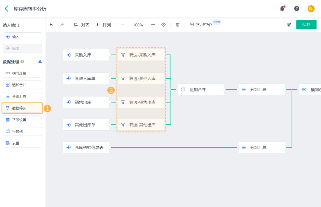 ![]() 1、数据工厂设置 (1) 新建数据流 进入「管理后台 >> 数据工厂」,可在右上角「新建数据流」,或直接点击「库存周转率分析」数据流查看示例内容: ![]() (2)设置输入数据源 添加库存相关表单作为输入节点的数据源,各表单选择字段 ![]() (3) 筛选合格数据 1)在「采购入库」、「其他入库单」、「销售出库」、「其他出库单」四个数据源后添加 数据筛选 节点: ![]() 2)通过入库/出库确认字段,筛选出字段值为「确认」的入库单/出库单。 以采购入库的数据筛选设置为例,添加筛选条件为:「合格品入库确认」等于「确认」;同理,设置其他数据源的数据筛选过滤条件如下: