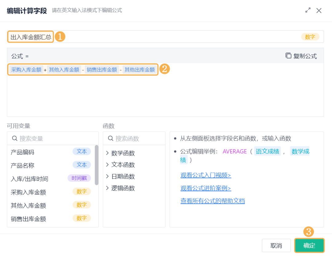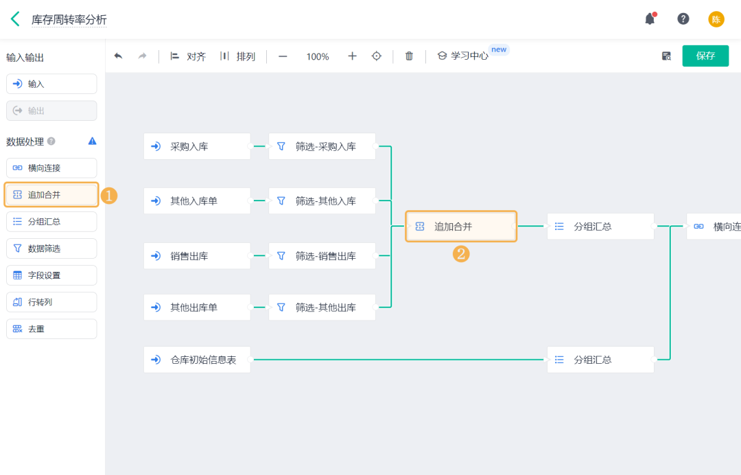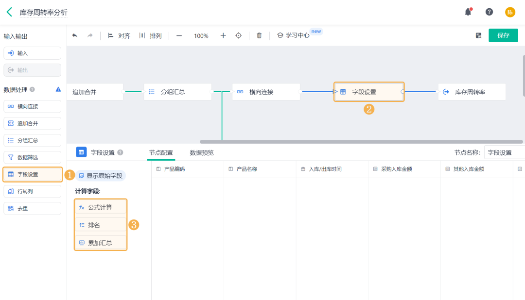 ![]() 3)期末库存金额 期末库存金额是指:一个库存会计时期结束时,可供使用或出售的存货库存余额。 添加「公式计算」,设置字段名称为「期末库存金额」,设置公式为空仓期末库存金额+初始库存金额。 ![]() 4)期初库存金额 期初库存金额是指:一个库存会计时期开始时,可供使用或出售的存货库存余额。 添加「公式计算」,设置字段名称为「期初库存金额」,设置公式为期末库存金额-出入库金额汇总。 ![]() (8)保存数据流 全部设置好以后,将输出节点重命名为「库存周转率」,点击右上角的「保存」,即完成了数据工厂的全部设置。 ![]() 2、仪表盘展示 (1) 新建仪表盘 数据工厂设置好后,可将数据流放在仪表盘中进行展示。回到应用访问界面新建一张仪表盘: ![]() (2) 产品库存周转率 产品库存周转率是企业在一段时间内销货成本与平均存货余额的比率,可用于反映存货的周转速度,判定存货的流动性及存货资金占用量的合理性等。 1)添加一个统计表,数据源为刚刚新建的数据流。点击「统计表 >> 数据流」,选择「库存周转率」数据流: ![]() 2)添加计算字段,字段命名为「库存周转率」,设置公式为销售出库金额/((期初库存金额+期末库存金额)/2): ![]() 3)图表类型选择「折线图」,添加维度和指标如下: