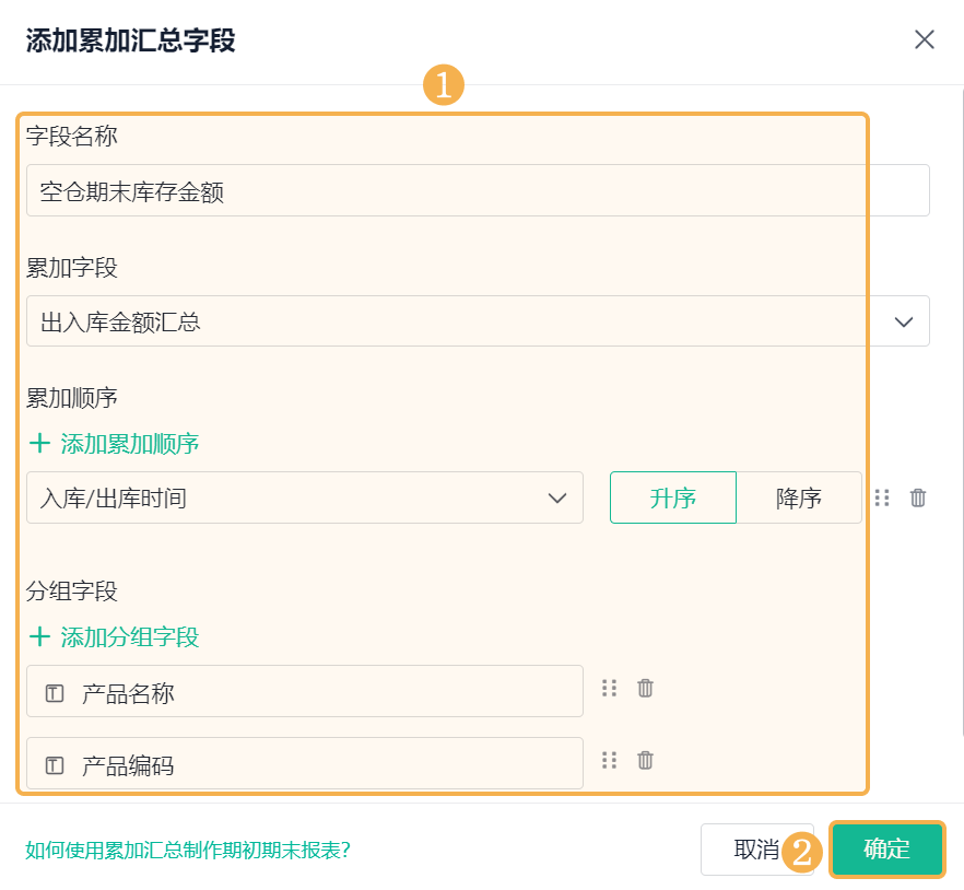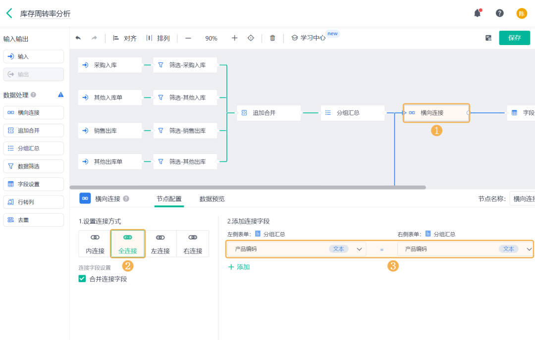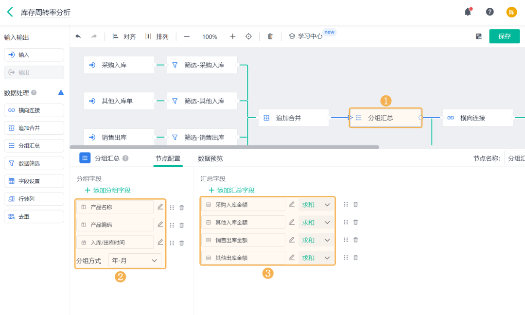 ![]() (4) 合并出入库数据 1)对数据筛选后的 4 张表单数据进行 追加合并,合并为一张表数据: ![]() 2)将不同表单中的出库/入库时间、产品名称、产品编码字段合并,并对各字段进行重命名,具体配置内容如下: ![]() (5) 分组汇总出入库总金额 1)在「追加合并」节点和「仓库初始信息表」后分别添加 分组汇总 节点: ![]() 2)其中,「追加合并」节点后的分组汇总用于计算各产品在不同月份出库/入库总金额: 分组字段:产品名称、产品编码、入库/出库时间(分组方式:「年-月」); 汇总字段:采购入库金额、其他入库金额、销售出库金额、其他出库金额,汇总方式:「求和」。 ![]() 3)「仓库初始信息表」后的分组汇总用于计算仓库中的初始库存金额。 添加「产品编码」、「产品名称」作为分组字段; 添加「产品成本合计」作为汇总字段,汇总方式设置为「求和」,重命名为「初始库存金额」。 ![]() (6) 横向连接 1)对分组汇总后的 2 张表单数据进行 横向连接,连接为一张表数据: ![]() 2)通过「产品编码」字段将两张表单的数据「全连接」为一张表,展示全部库存产品数据: ![]() (7)添加计算字段 在「横向连接」节点后添加 字段设置 节点,添加计算字段,用于计算出入库金额汇总、空仓期末库存金额、期末库存金额、期初库存金额: ![]() 1) 出入库金额汇总 出入库金额汇总是指:全部入库金额相加再去掉全部出库金额。 添加「公式计算」,设置字段名称为「出入库金额汇总」,设置公式为采购入库金额+其他入库金额-销售出库金额-其他出库金额。 ![]() 2) 空仓期末库存金额 空仓期末库存金额是指:对出入库总金额按照出/入库时间进行累加计算。 添加「累加汇总」,设置内容如下: