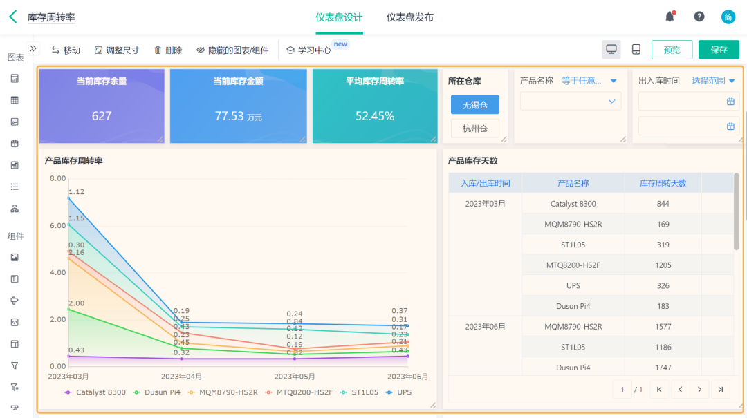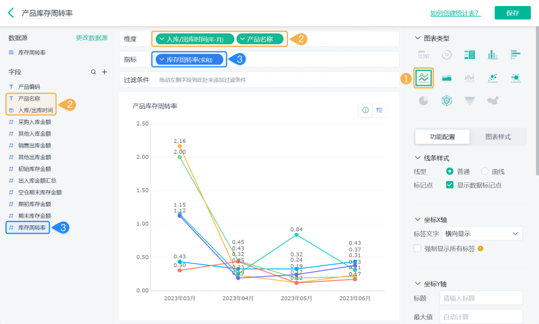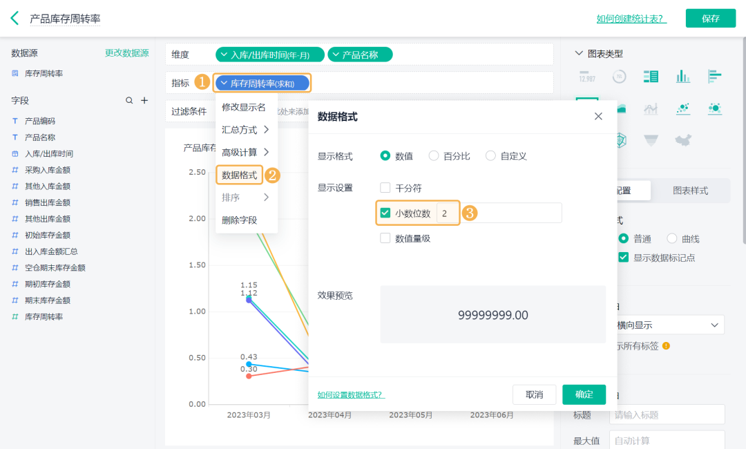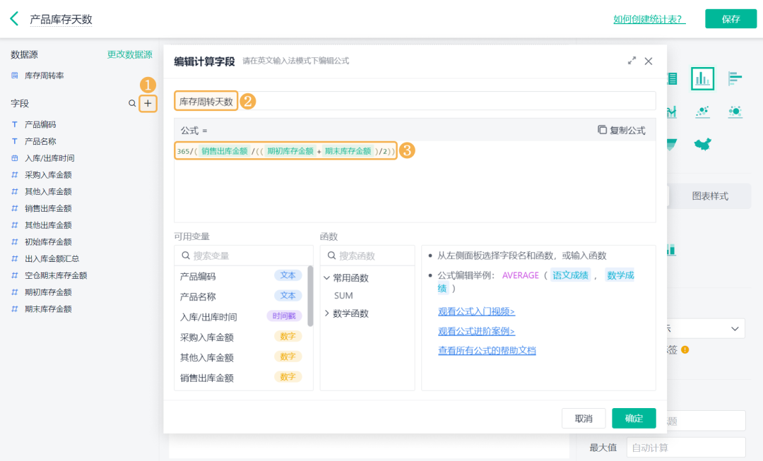 ![]() 4)设置「库存周转率 >> 数据格式」的小数位数为 2: ![]() (3) 产品库存天数 产品库存天数是指将库存周转率换算成具体的天数。 1)添加一个统计表,数据源为刚刚新建的数据流。点击「统计表 >> 数据流」,选择「库存周转率」数据流: ![]() 2)添加计算字段,字段命名为「库存周转天数」,设置公式为365/(销售出库金额/((期初库存金额+期末库存金额)/2)): ![]() 3)图表类型选择「透视表」,添加维度和指标如下: 维度:入库/出库时间、产品名称 指标:库存周转天数(求和) ![]() (4) 其他图表 1)还可以根据业务需求制作其他图表,如当前库存余量,当前库存金额、平均库存周转率等: ![]() 2)详细设置内容和界面配置可在「进销存(标准版)>> 库存管理 >> 库存周转率」处点击「编辑」查看: 库存周转率其实是一个反映你存货管理效率的重要指标。